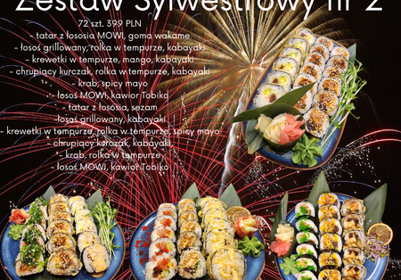 Nigiri krewetka w tempurze 2 szt. Mak tykwa (cała rolka w tempurze) 10 szt. Futo łosoś 6 szt. Futo węgorz pieczony (cała rolka w tempurze) 6 szt. Cali Tuńczyk 10 szt. Dragon Sake Yaki 10 szt.